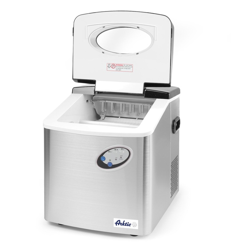Tabletop model. Casing made of stainless steel. Capacity of 15 kg per 24 hours, buffer stock of 4,5 kg - 12 cubes per cycle. No fixed water connection - coolant: R134A. Choice of 3 ice cube sizes, cubes are formed around cooling rods. Holds 150 ice cubes.