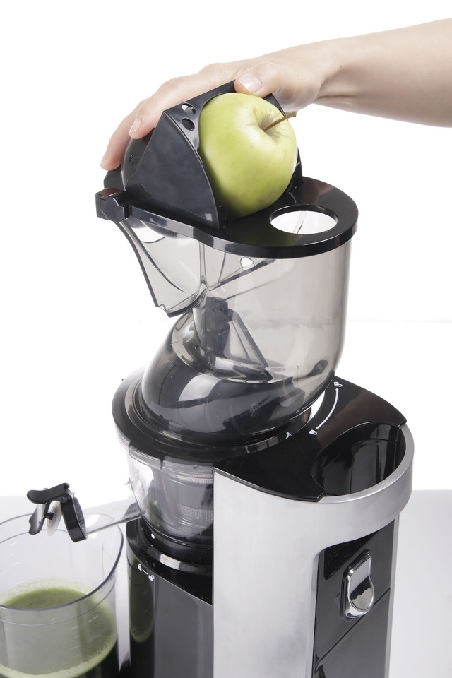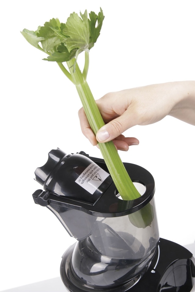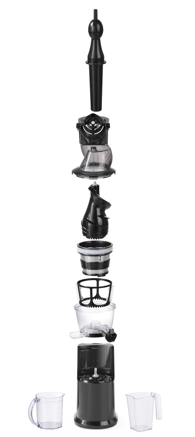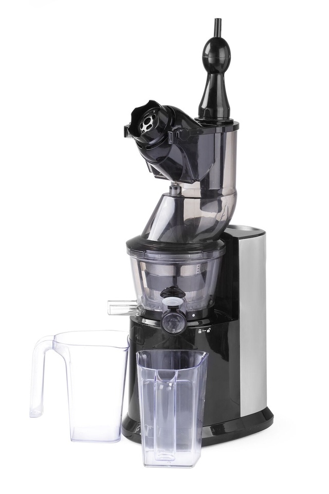 Ideal for: fresh juices, mousses, paste and fruit cocktails. Suitable for soft (blueberries, raspberries, strawberries) as well as hard fruit and vegetables (beetroot, turnip, ginger) and herbs, grass, sprouts (nettle, wheatgrass, dandelion). In comparison to traditional juicers, this device squeezes much more juice and the remaining fruit and vegetable pulp is almost completely dry which proves the exceptional performance of the device. The juice squeezing process is similar to mechanical cold-pressing. Number of rotations: 45 rpm. Reverse function to unblock the auger. Strong induction motor assuring high power and durability of the device. Very quiet at work: 65 dB. Magnetic protection prevents switching on if the head is incorrectly fitted. Maximum continuous work time: up to 20 min. Large feed chute with mechanism preventing the insertion of hands Ø83 mm (e.g. apples, pears, turnip). Small feed chute Ø42 mm with a pusher for long vegetables (e.g. carrots, parsnip, leek). Juice spout with a practical and tight cap. Inner strainer made of AISI 304 steel. Auger, strainer frame and strainer elements made of TRITAN – BPA free. Housing with a practical handle made of satin aluminium and ABS. Easy to use and clean. Weight: 7.2 kg. Two polycarbonate containers for pulp and juice, 850 ml each. Cleaning brush with nylon bristles.