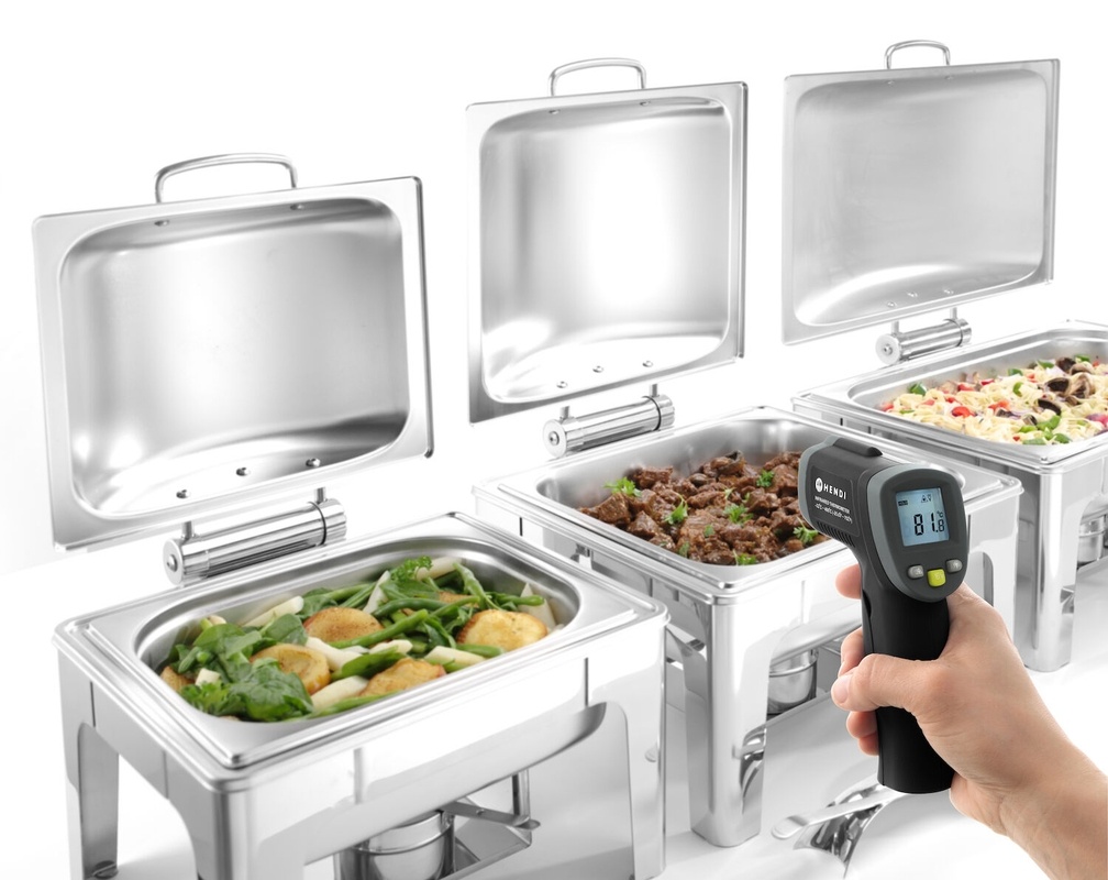 Laser pointer for accurate target aiming. Measuring range -32°C to 400°C. Gradation 0,1°C, accuracy ±1,5°C/±1,5%. Distance spot ratio 12:1. Lock mode for continuous temperature monitoring. Turns off automatically. Battery included.