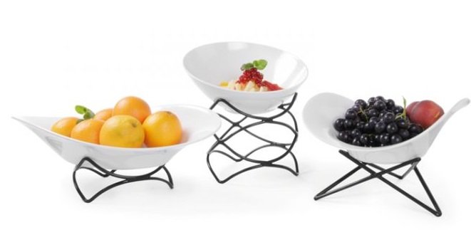 Steel frame with PVC coating. Supports a variety of display trays and bowls.