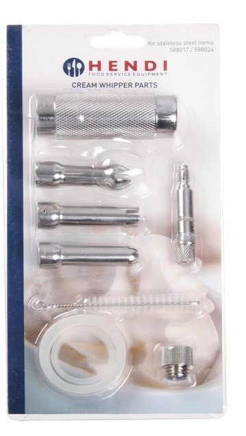 Set for Hendi cream whippers. Contains 3 nozzles, cartridge holder, gaskets, valve and cleaning brush.