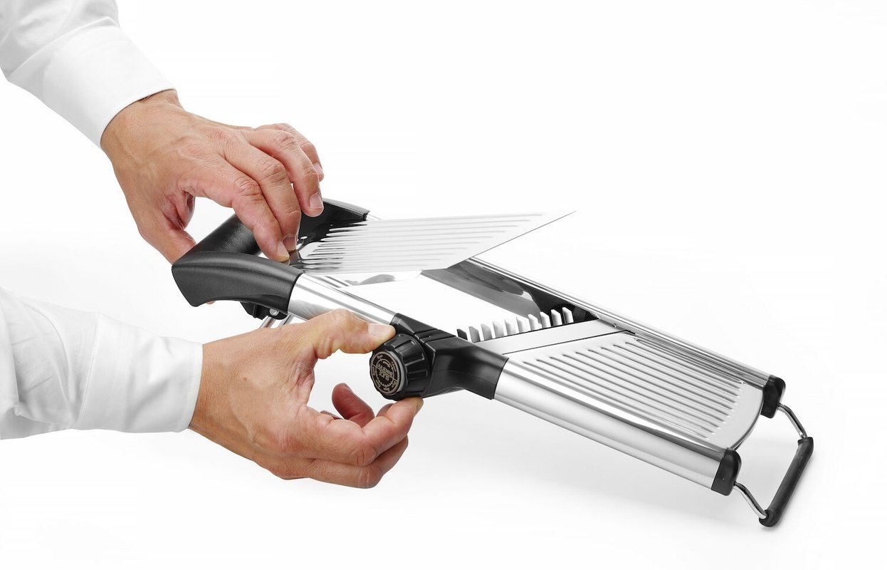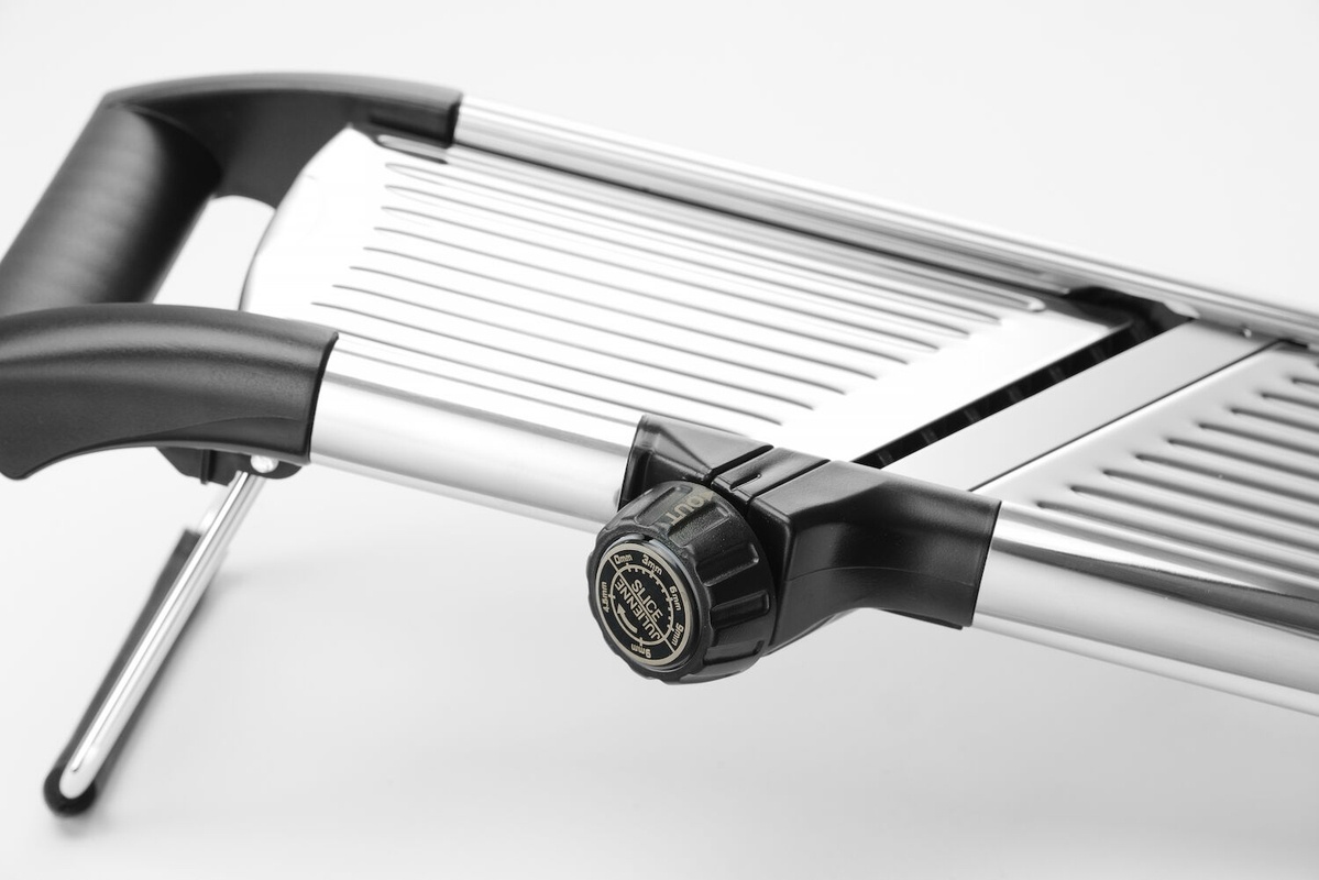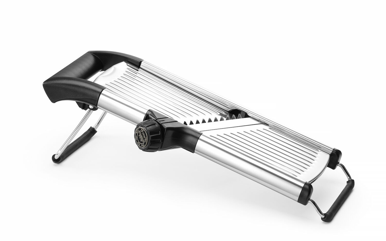 2 blades for slicing (1 crinkle blade) and 3 blades for jullienne (5, 7, 10 mm). Sliding product holder and storage box for blades. With non-slip stand.
