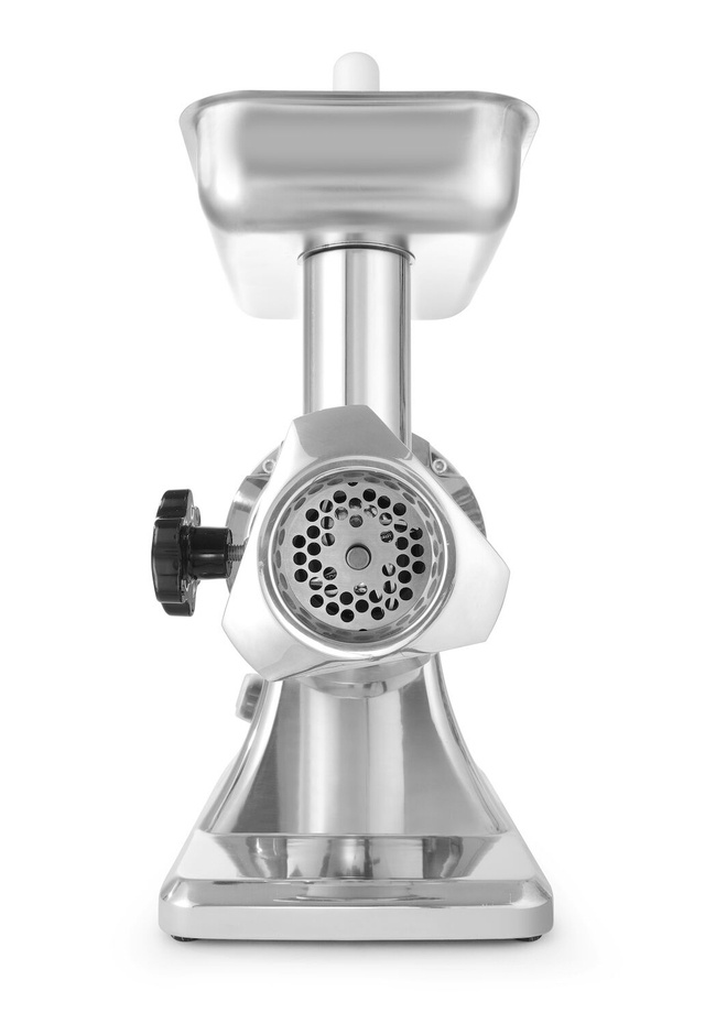 High-quality professional device for grinding all kinds of skinless and boneless meat. Worm screw made of a special aluminium alloy. Body, hopper and meat container made of stainless steel. Polyethylene pusher included. Oil bathed gears (for smooth and extra quiet operation). Mincing disc diameter: 70 mm, holes: Ø 6 mm. Weight 19 kg. Not for continuous use. Output 200 kg/h.