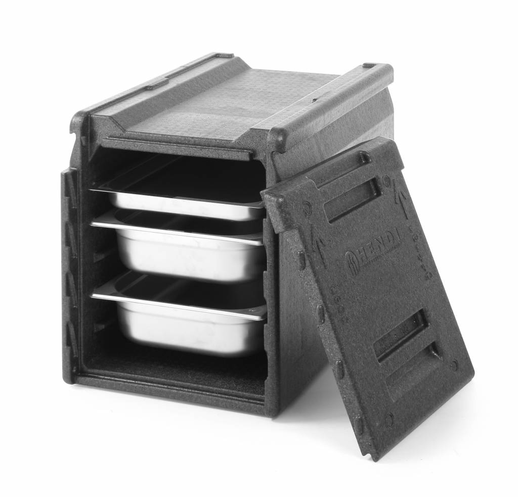 Ultra-lightweight, durable container with perfectly sealable opening. Removable door – even if the boxes are stacked With 5 grooves spaced 65 mm apart to slide in containers, fits GN1/1 containers. The high stacking ledges with locking profile ensures stable stacking without sliding. Fits perfectly on Euro pallets – four boxes per layer