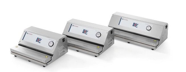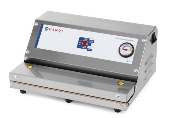 Made of stainless steel. Professional vacuum pump and pressure gauge. Manual or automatic operation. Digital display. Adjustable sealing time. Teflon-coated sealing strip. Pump capacity: 20 L/min. For use with embossed bags only.