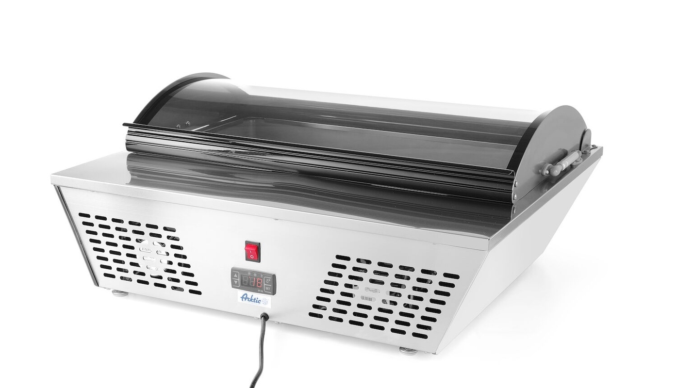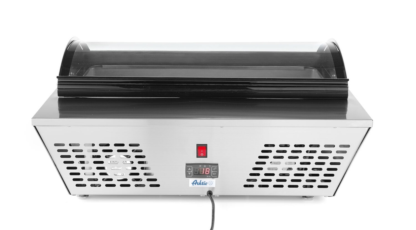 Body made of high-quality stainless steel, fitted with curved glass cover with easy opening system. Forced air cooling with auto-defrost, compressor placed next to the chamber. Fits 8x GN 1/6 GN containers or 4x GN 1/3 containers (max. height 150 mm). With 4 adjustable stainless steel feet. Digital temperature controller and display. Refrigerant: R600a. Climate class: 4