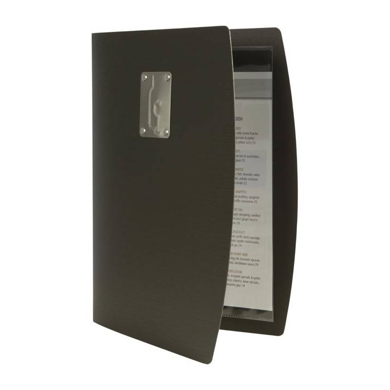 Modern Rio A4 Wine List Holder in black with stainless steel front plate engraved with wine bottle and glass design. Made from durable plastic with a textured pattern, the holder is easy to clean and perfect for discreet drinks lists in fashionable modern venues. Elasticated inner cord holds inserts securely in place. One double insert included (displays 4 pages).