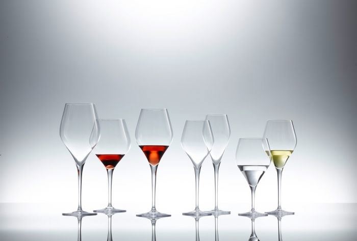 Fineness and elegance distinguish the gourmet series of stemmed glasses FINESSE. The fine stem of the glass fluently attaches itself to the goblet and creates the range of elegant, timeless contours. Regardless of the type of table: festive or classically laid-it adorns both. FINESSE provides the particular fine touch to any kind of arrangement. A distinctive bend in the goblet perfectly supports the different types of wine and grape and provides for a generous surface to develop the soft bouquet. The narrow tapered chimney additionally bundles the scent in the glass and allows for an intensive and authentic sensory perception of the individual aromas. Seven sizes – Bordeaux, red wine, Burgundy, Chardonnay, Riesling, Champagne and water – offer the perfect companion for each type of wine and perfectly map the corresponding aromas.