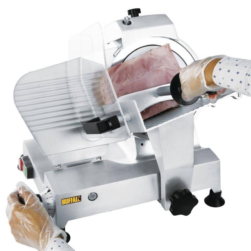 The Buffalo meat slicer combines impressive cutting strength and commercial reliability. With its large 220mm blade and numerous safety features, you can easily cut through ham, beef, poultry or vegetables with the minimum of fuss - perfect for deli counters, restaurants or farm shops.