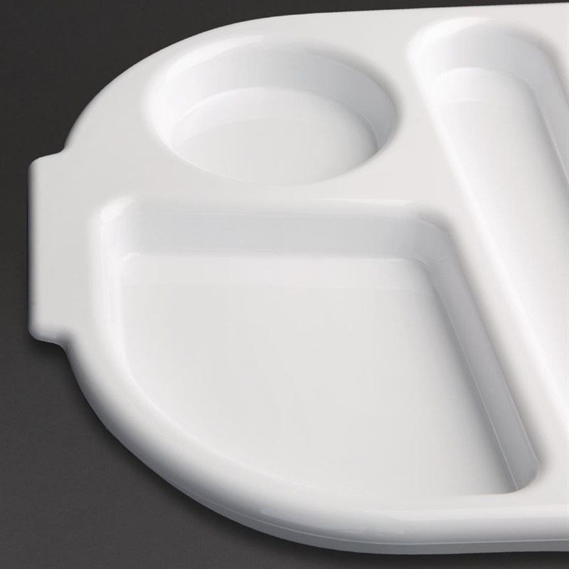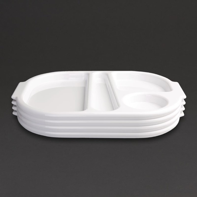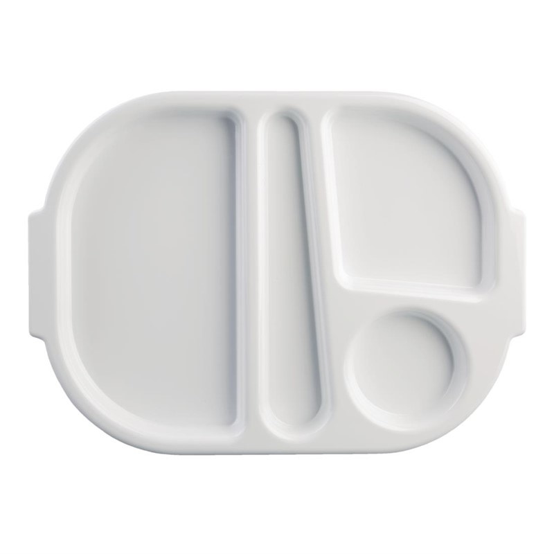 Polycarbonate trays with compartments to separate food. Ideal for schools, hospitals and care homes. Stackable for easy storage.