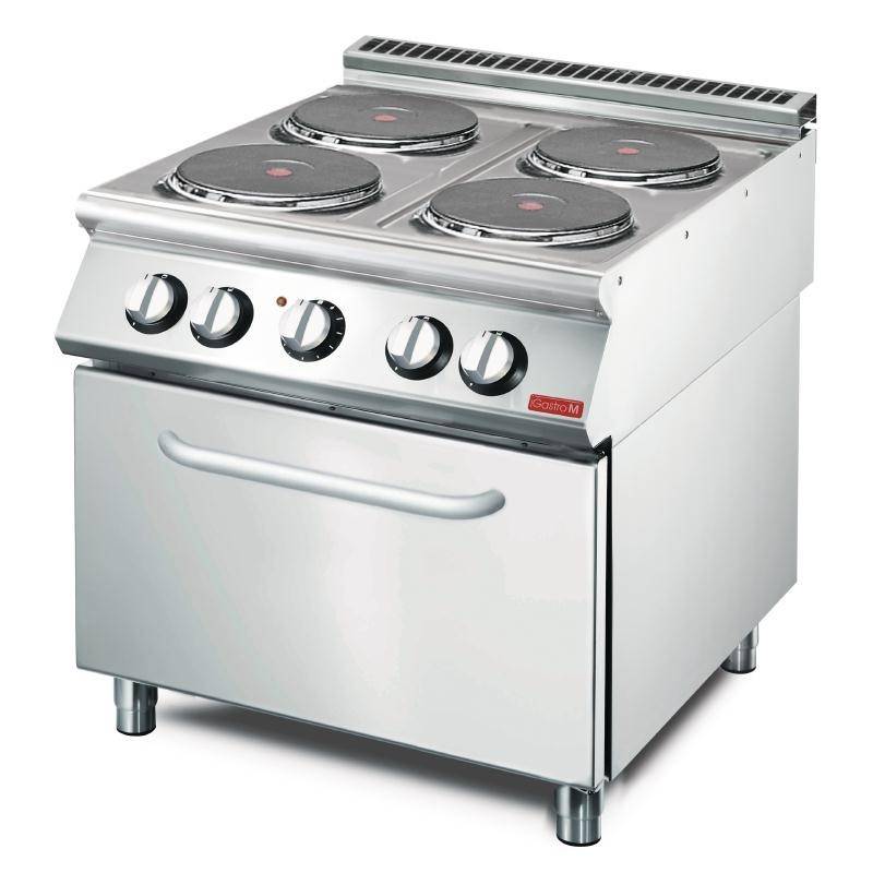 Stainless steel electric range with 4 independently controlled cooking plates and electric convection oven. The oven features 6 stand regulator, thermostat and indicator light. Adjustable feet for stability on uneven floors.