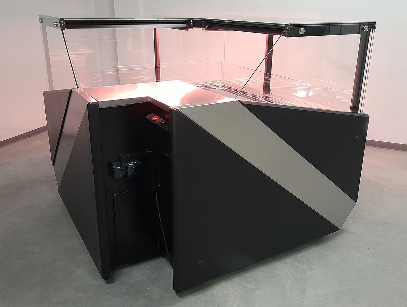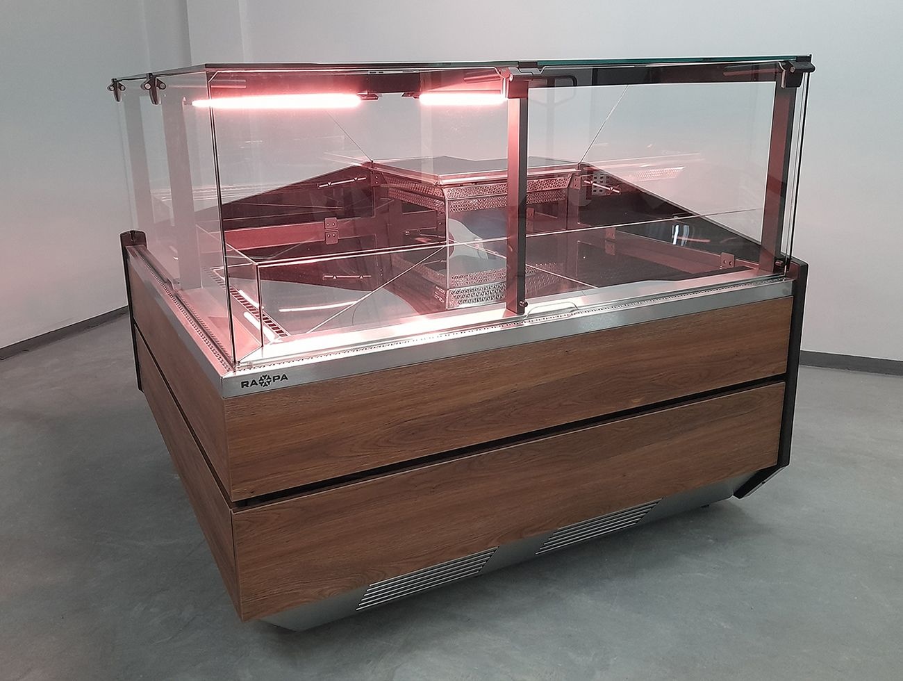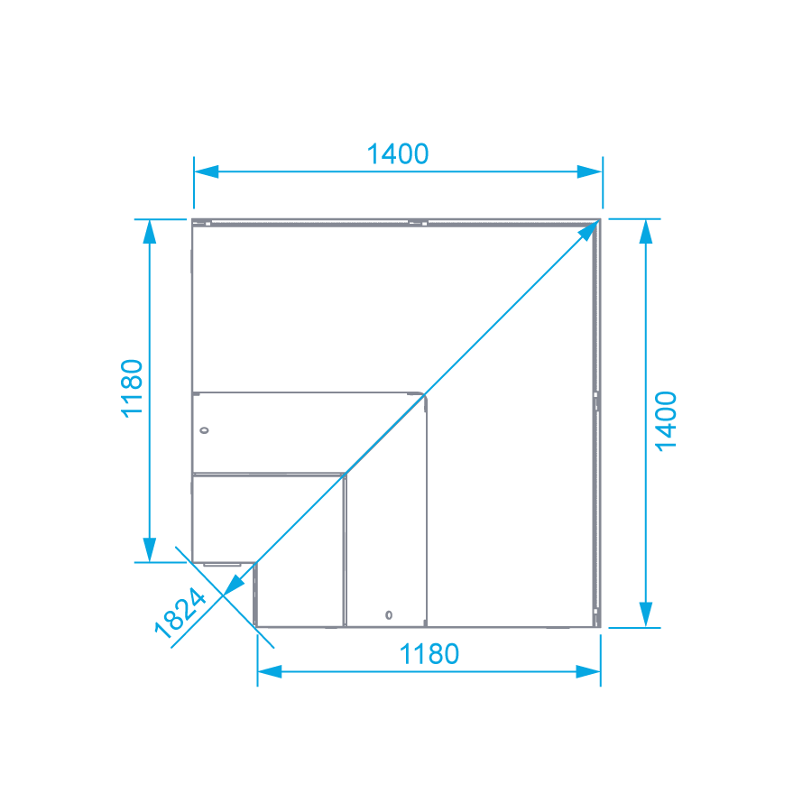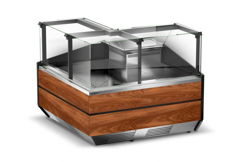 Lada chłodnicza narożna, szyba prosta od 1 do 10 °C, 1450x1450x(h)1210 mm z płytą meblową Yosemite