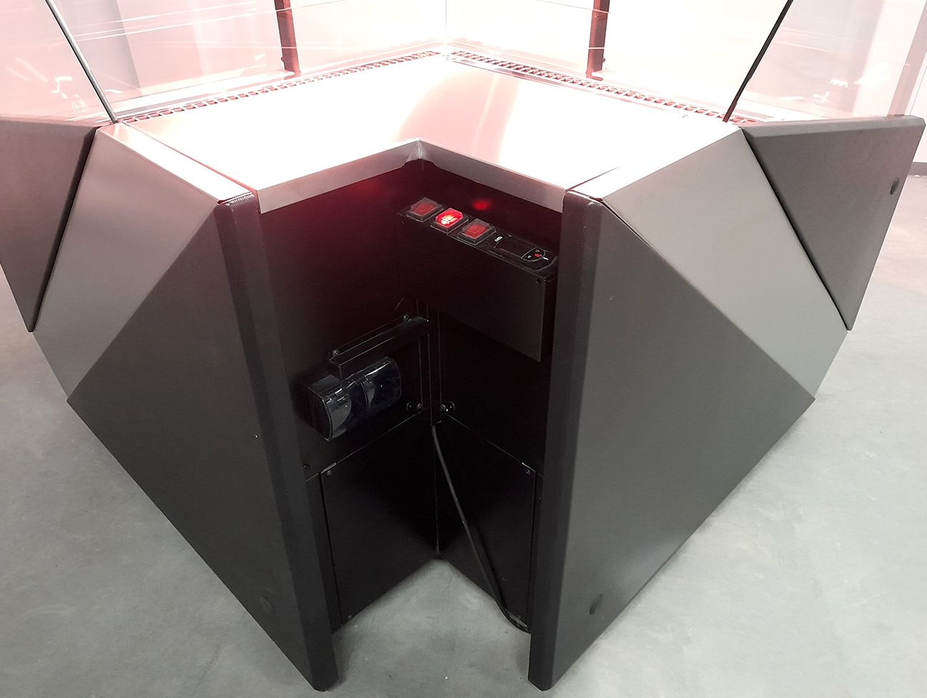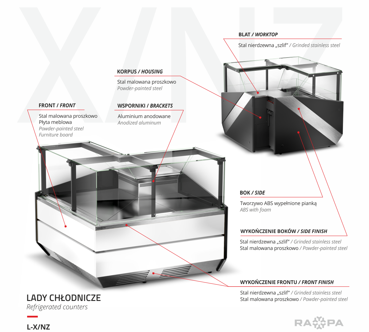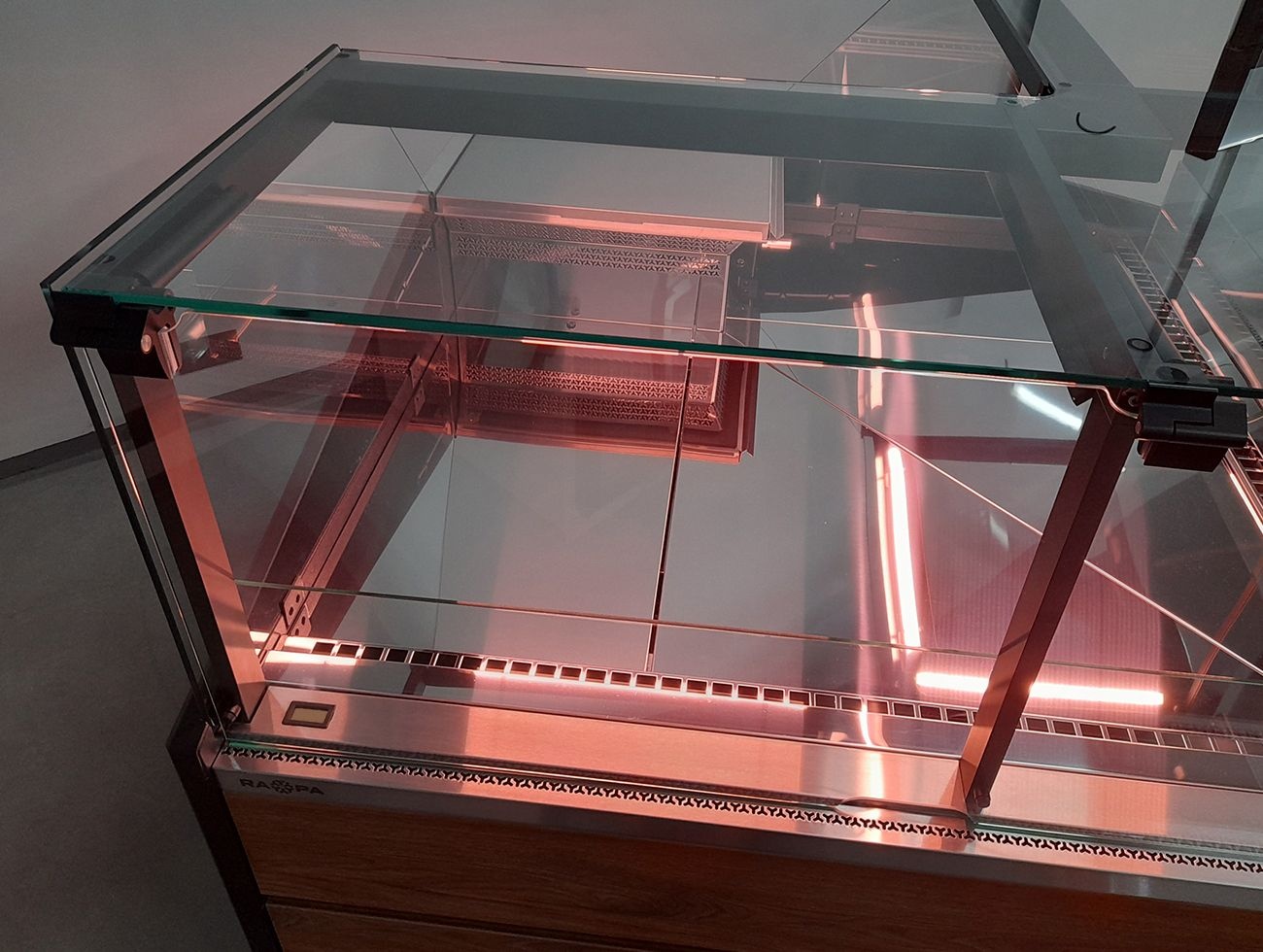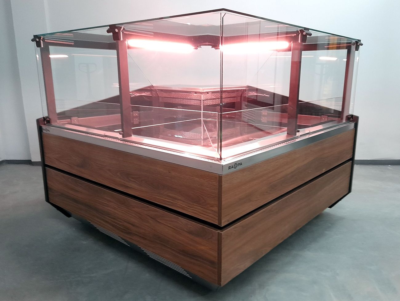 Lada chłodnicza narożna, szyba prosta od 1 do 10 °C, 1450x1450x(h)1210 mm z płytą meblową Yosemite