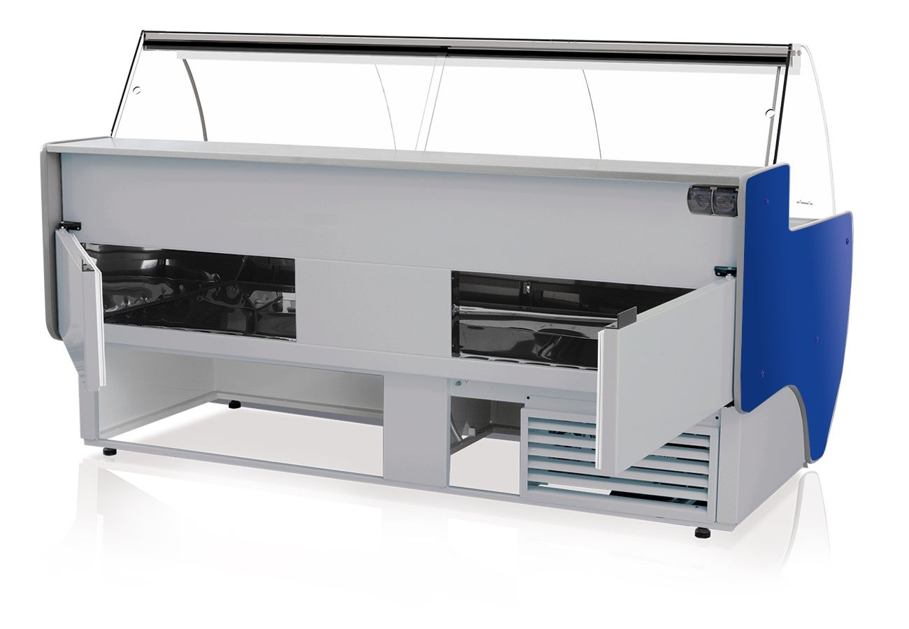 Lada chłodnicza, szyba gięta od 1 do 10 °C, 1520x900x(h)1220 mm z niebieskim frontem