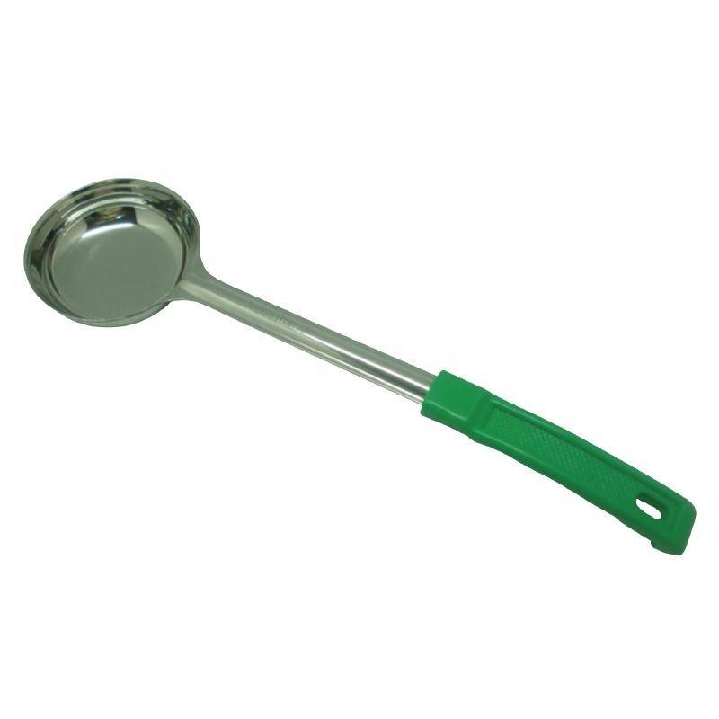 Accurately control portion sizes with the Vogue 118ml green spoodle. Designed with a convenient thumb grip and ergonomic handle, the spoodle is comfortable and stable in the hand, helping you serve precise portions quickly and easily. Colour coded green, the spoodle helps staff easily identify the correct size spoodle for each culinary task, reducing wastage in your kitchen. Constructed from heavy gauge stainless steel, the utensil is also incredibly robust and durable, allowing it to withstand the demands of any busy commercial catering business.
