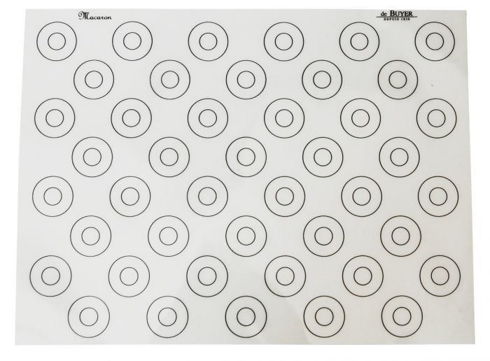 Thin baking mat with marks, in silicone-coated glass fibre canvas. Designed for making macaron shells. Use for cold and hot: withstands extreme temperatures (from -40°C à +230°C). Thin and very flexible mat: adaptable to all types and shapes of underlyhing baking support; does not affect the transmission of cold or heat. Non-stick: easy pastry removal, better visual appearance. Marks: ideal for calibrating macaron shells and other pastries; they facilitate macaron assembly. Simple to use and efficient: - Large diameter: filling area. - Small diameter: positioning of the nozzle at the centre. Hygienic: easy to keep clean. Do not store folded. Do not heat alone on a tray. Care: dishwasher-safe. Dry thoroughly before storing flat.