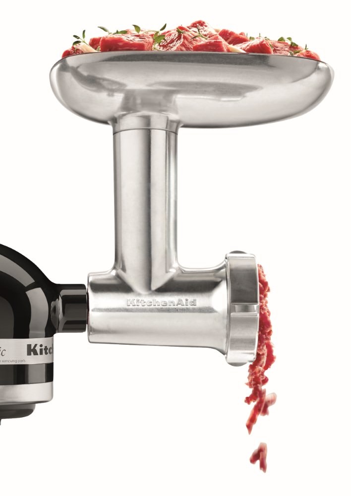 The sturdy mincer for the KitchenAid crushes, grinds and chops all sorts of ingredients. The different perforated discs are suitable for the preparation of minced meat, spreads, grated cheese and much more.