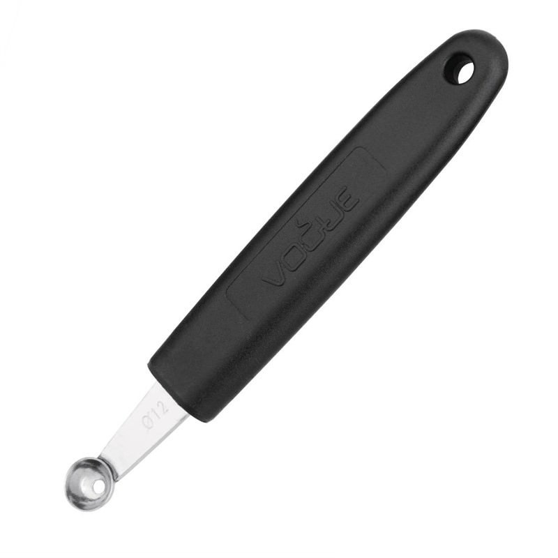 Create perfectly shaped melon balls with the Vogue 12mm melon baller. Constructed from stainless steel, the baller head quickly carves into all manner of ingredients, allowing you to obtain consistent spheres to improve your presentation and control portion sizes. Made with an ergonomically designed polypropylene handle, the utensil is also incredibly comfortable in the hand, helping you cope with lengthy tasks. Ideal for salads and garnishing dishes and cocktails, the professional utensil will help you add a touch of class to your service.
