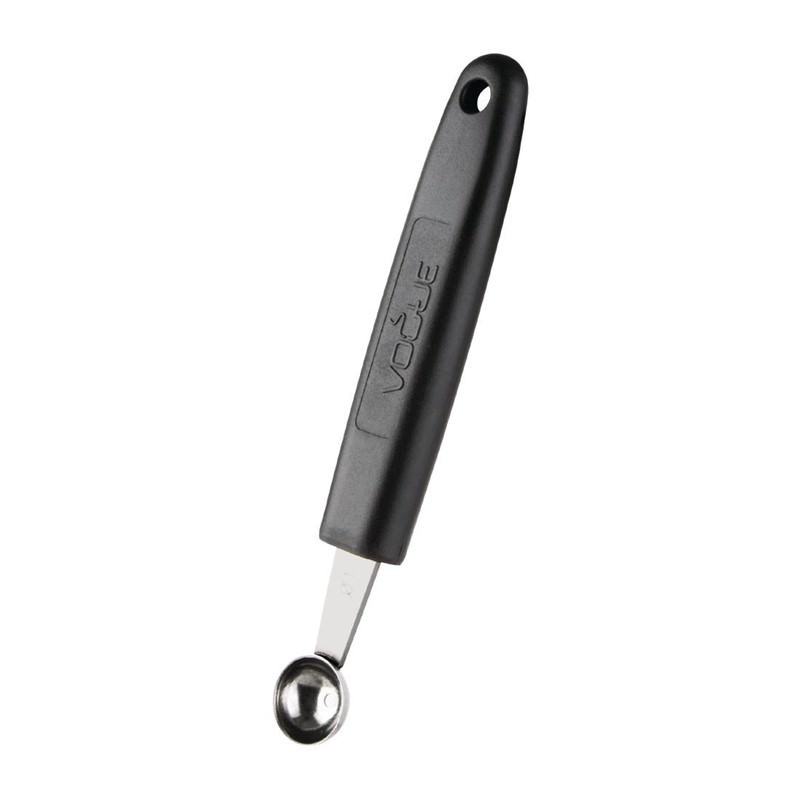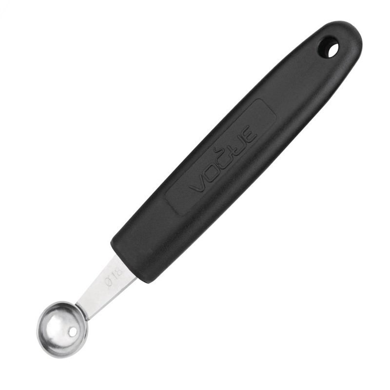Create perfectly shaped melon balls with the Vogue 18mm melon baller. Constructed from stainless steel, the baller head quickly carves into all manner of ingredients, allowing you to obtain consistent spheres to improve your presentation and control portion sizes. Made with an ergonomically designed polypropylene handle, the utensil is also incredibly comfortable in the hand, helping you cope with lengthy tasks. Ideal for salads and garnishing dishes and cocktails, the professional utensil will help you add a touch of class to your service.