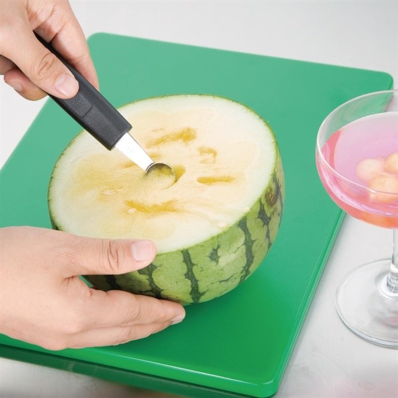 Stainless steel with polypropylene handle. Create perfectly shaped melon balls for attractive plate presentation. Can also be used with a variety of other ingredients.