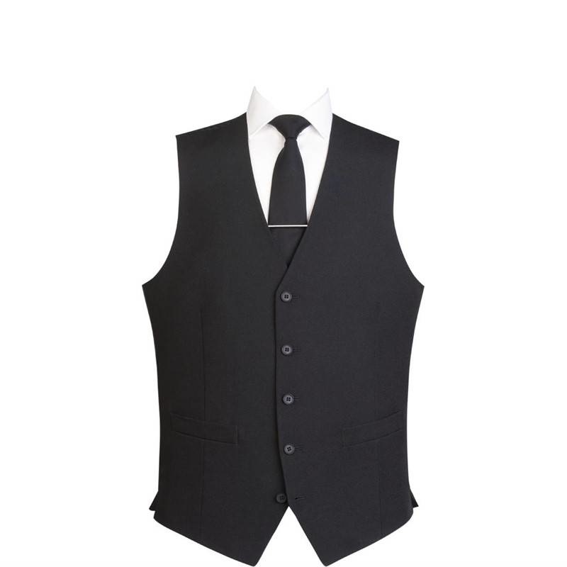 Sharply cut, neatly hemmed and made to traditional fit standard, Events men's black extra extra large (XXL) waistcoats will elevate your restaurant staff presentation to the next level. The garment features the classic five button fastening ensemble for adjustable sizing that suggests timeless grace and discreet yet debonair service. Made completely out of polyester, these superb quality waistcoats wash and dry easily and hold excellent memory characteristics for a more comfortable fit over time. Better still, because polyester holds very little moisture in weight the waistcoats retain incredible dimensional stability, meaning temperature and humidity will be the last of your worries during service.