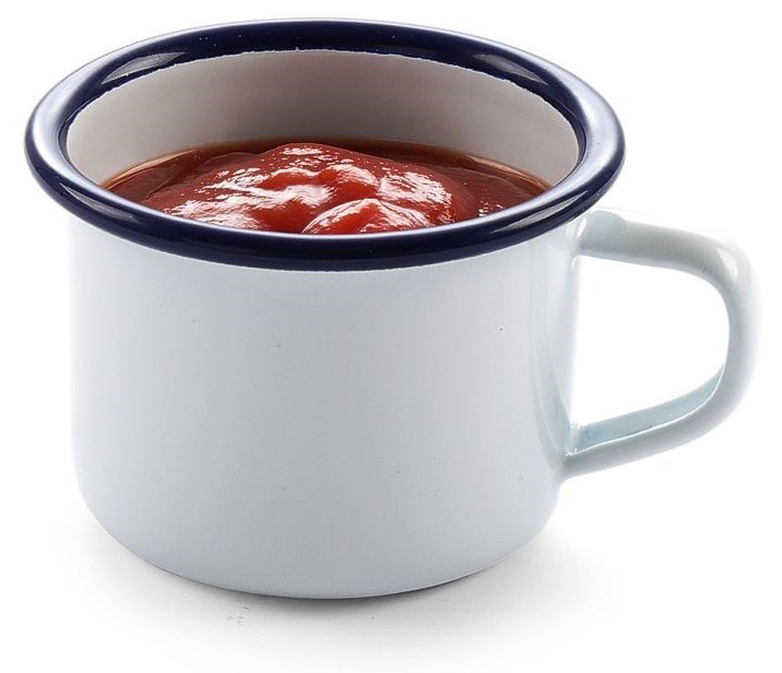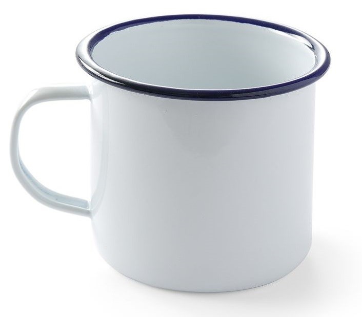 Enamelled tableware has made a comeback. White enamelled steel with a nice blue border. High quality enamel. Abrasion resistant.