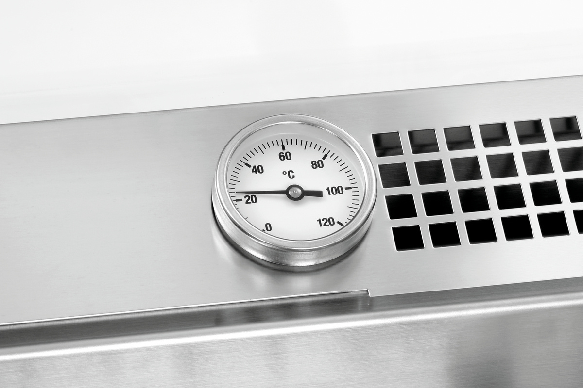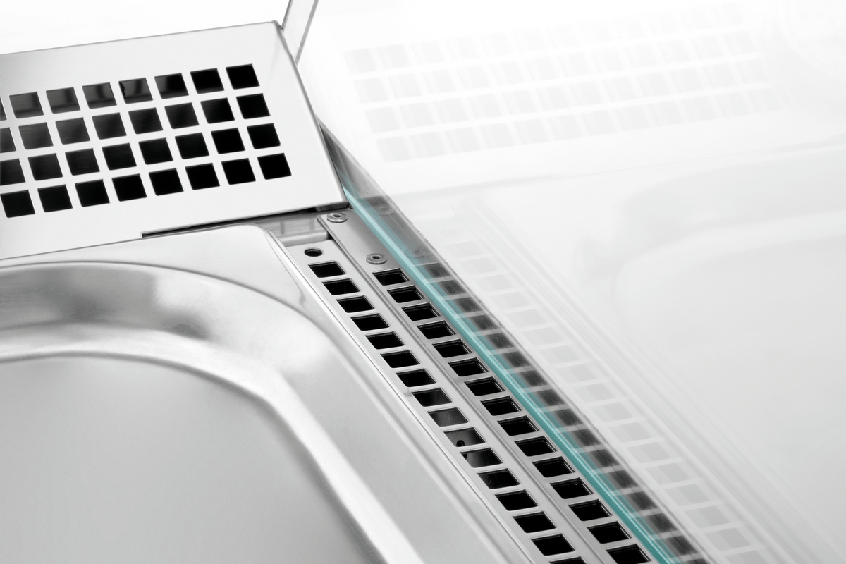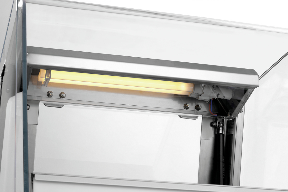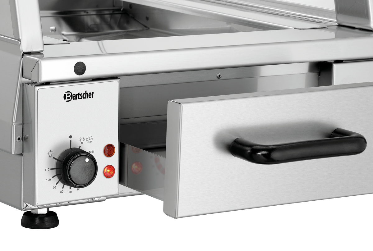 Nablatowa witryna grzewcza 80 L, 2-poziomowa, 0,80 kW, od 30 do 110 °C, z szybą giętą, srebrna