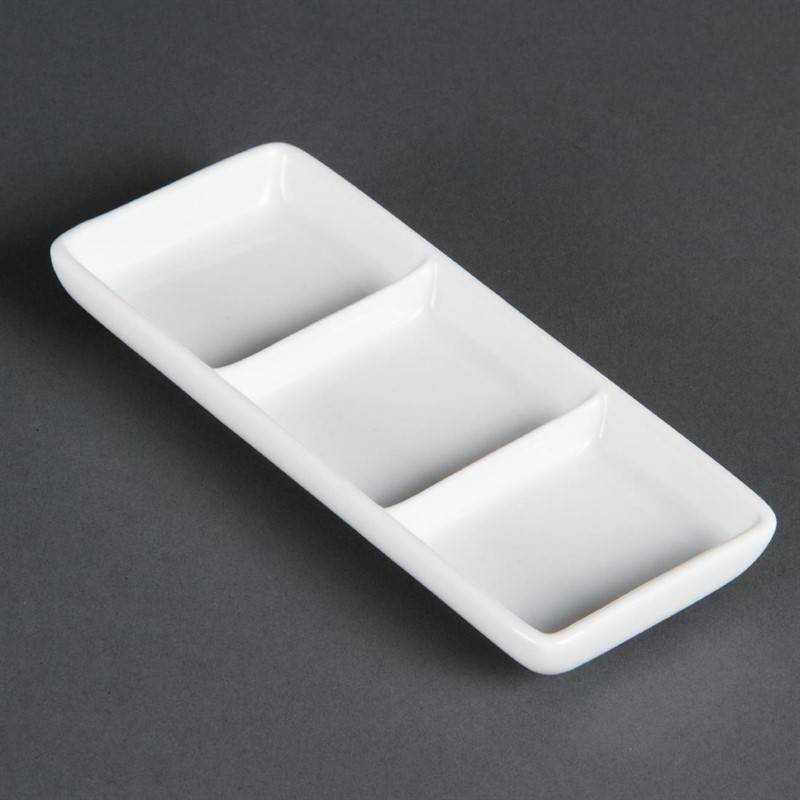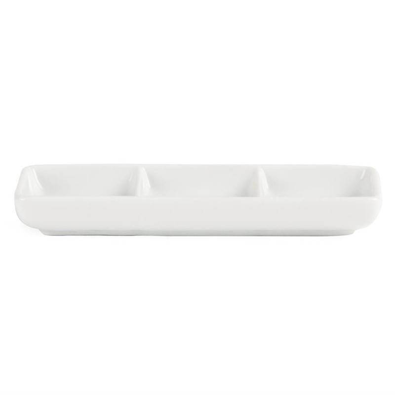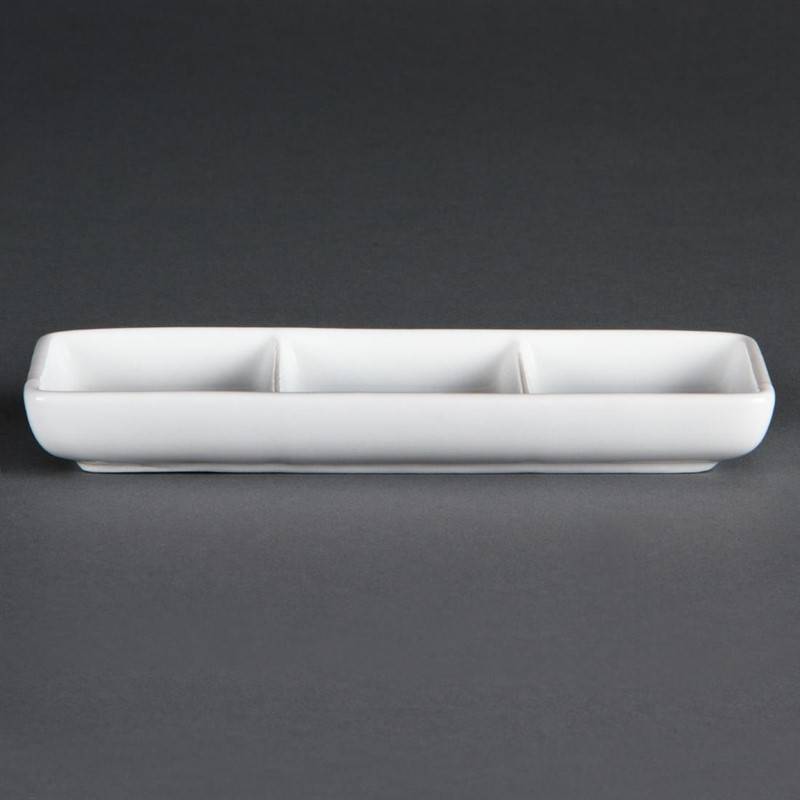 Great value pure white porcelain 2 1/2x 6" three section display dish for presenting food by Olympia, ideal for snacks and dips.