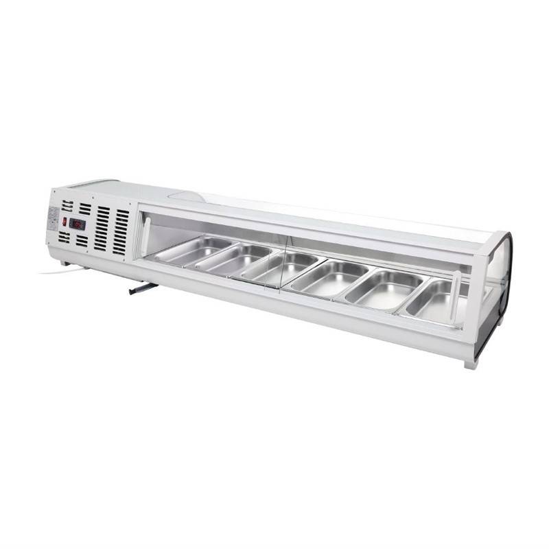 Suitable for cafés, delicatessens, coffee shops and more, the topper effectively keeps up to six 1/3rd size gastronorm pans of food hygienically chilled and perfectly presented. With attractive curved glass and efficient LED lighting, this tapas showcase is ideal for maximising impulse sales of cakes, sandwiches, pastries and tapas. GN pans sold separately.