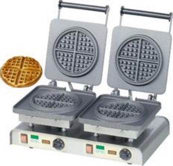 The American breakfast waffle is typically topped with bacon and maple syrup. This is a full meal size waffle. • stainless steel casing • baking plates non-stick coated aluminium – fix mounted • 2 on/off switches • 2 digital timers • 2 pilot lights • 2 thermostats • height-adjustable feet • for 2 waffles of Ø 190 x h 30 mmSpecifications
