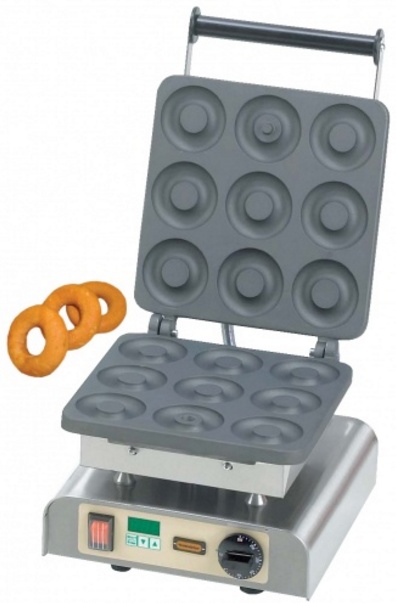 Tasty donuts as a low-fat baked version from a waffle maker. • stainless steel casing • baking plates non-stick coated aluminium – fix mounted • on/off switch • digital timer • pilot light • thermostat • height-adjustable feet • for 9 donuts of Ø 80 x h 26 mmSpecifications