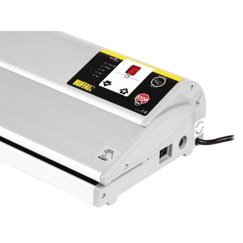 Save money and reduce food waste with the powerful and cost effective Buffalo professional vacuum packing machine. Able to seal embossed bags up to 300mm wide, the machine helps you to prep food in advance, whether you're freezing, sous vide, microwaving or boiling. The Buffalo is incredibly easy to use and includes 4 customisable vacuuming modes for maximum flexibility. There's also a quick-stop and seal function - a handy addition to this compact, commercial vacuum sealer.