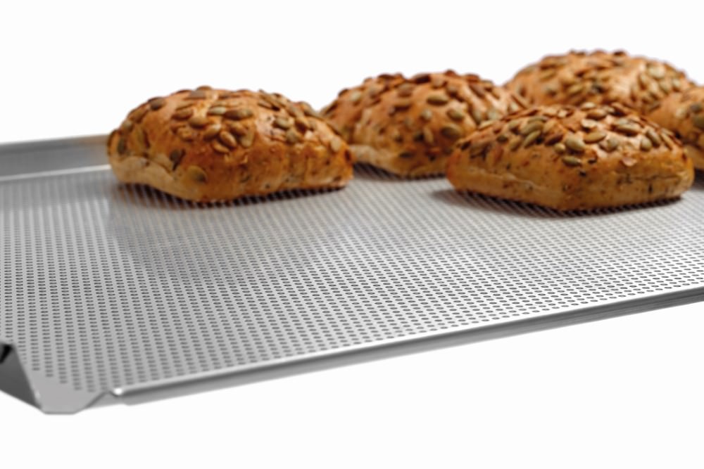 The perforated aluminium sheet in the bakery norm format 600x400 is temperature resistant up to 260 °C. The 3-sided edge allows safe baking and transporting.