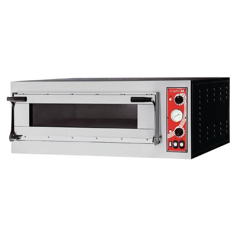 Pizza ovens with stainless steel exterior and clay interior for effective baking of pizzas. Each chamber can fit four pizzas and has a separate top and bottom thermostat. Complete with on/off switch, indicator light and thermal cut-out.