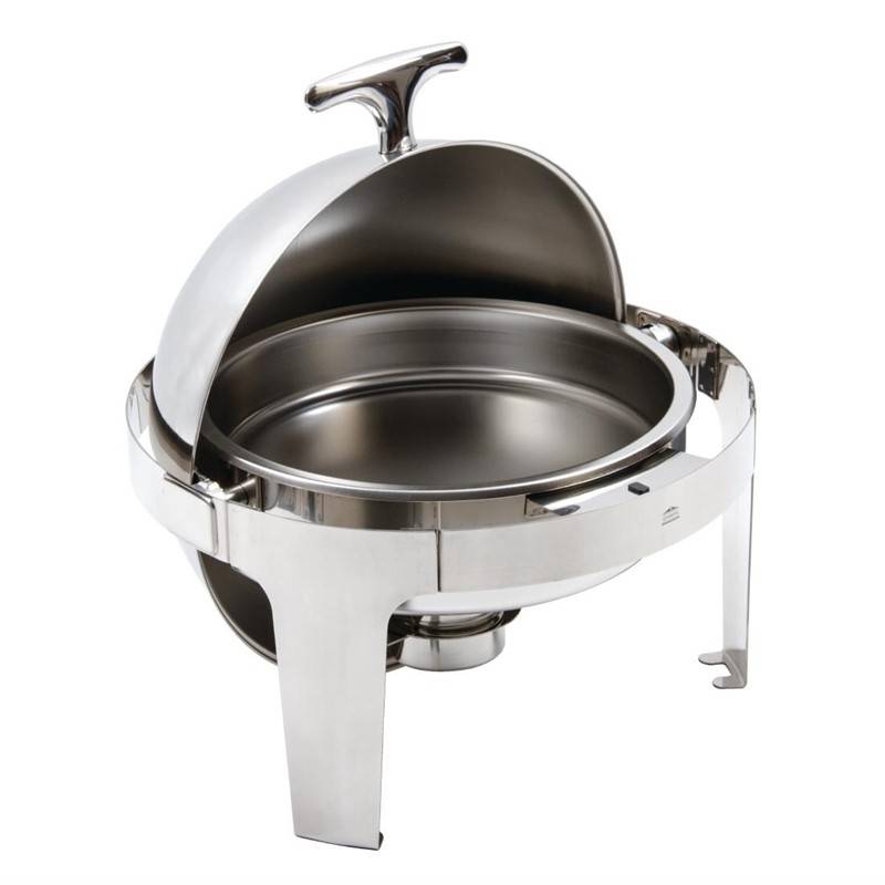 Polished 18/8 stainless steel round chafing dish with roll top for ease of use. Stainless steel plate legs. Supplied with water pan, food pan, cover and fuel holder. 450(H)x 520(W)x 480(D)mm.