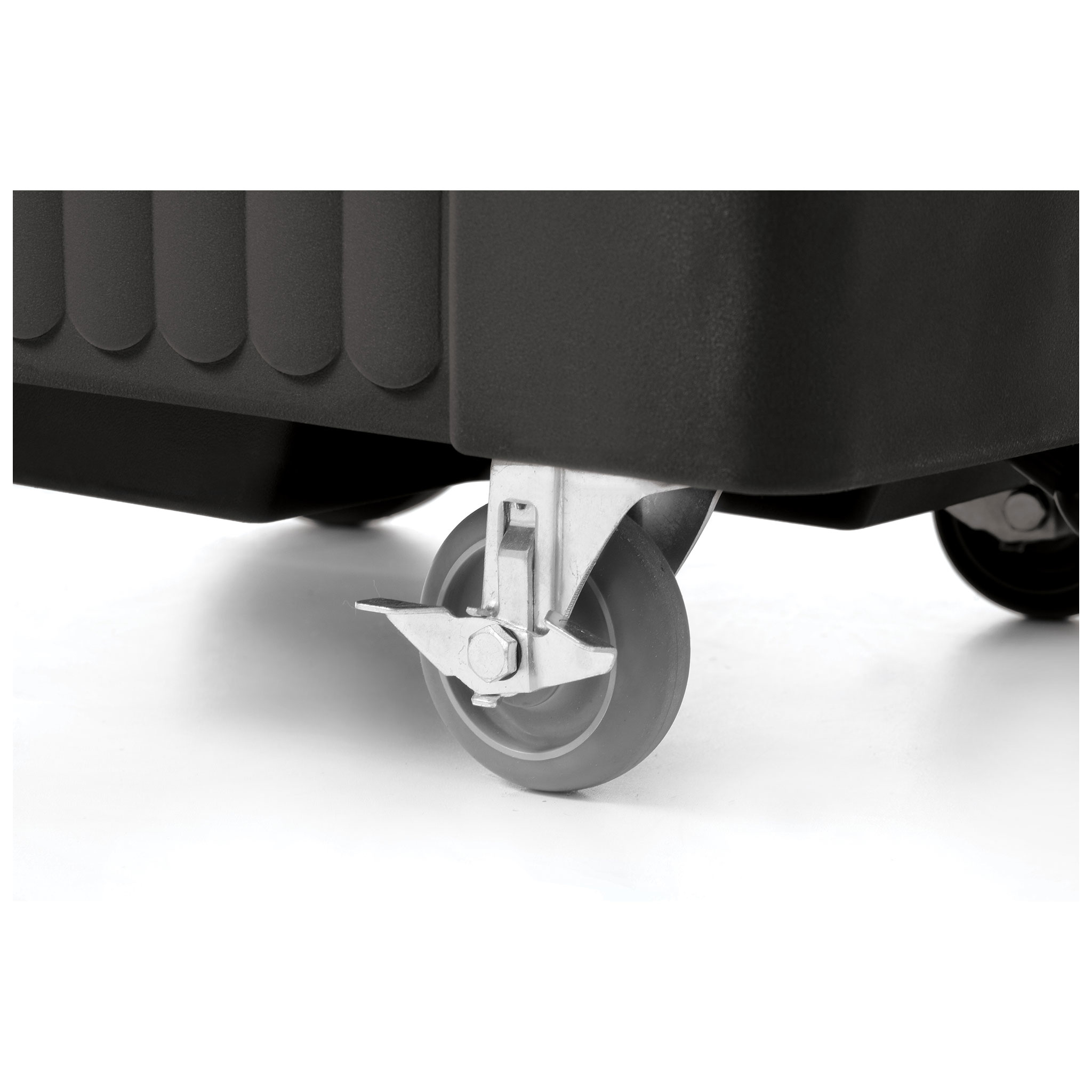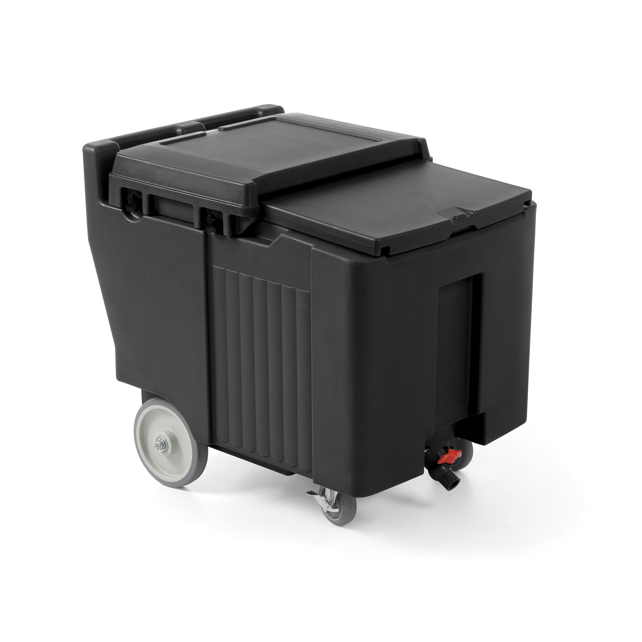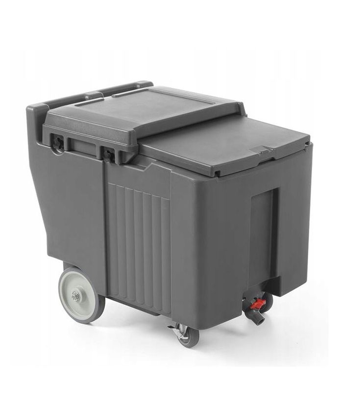 Ideal to transport ice cubes or flakes over long distances. Robust polyethylene housing resistant to shocks and impact. Thick foam insulation to keep ice temperature as long as possible. Inner walls resistant to scratches and stains. Sliding, sealed lid allowing easy scooping of ice. Ergonomic grip integrated with housing. Two large wheels resistant to uneven ground and two smaller castor wheels with brake. Profiled drain for melted ice in chamber, with tap. Delivered ready-to-use, does not require assembly. 4 wheels, 2 with brakes (large ø20 mm, small ø10 mm). Tap, scoop and drip tray included.