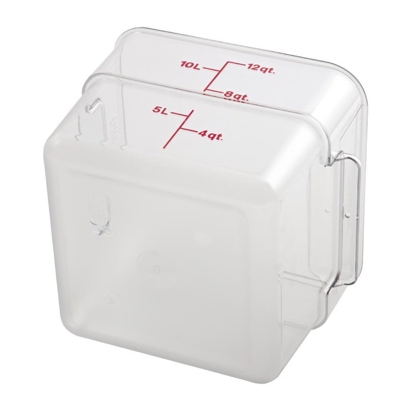 Extremely tough polycarbonate containers. Clear plastic for quick identification of contents. Virtually unbreakable. Stain resistant against oil, food acids and more. Square shape allows you to nest the containers together and save storage space. Suitable for temperatures from -40°C to 99°C.