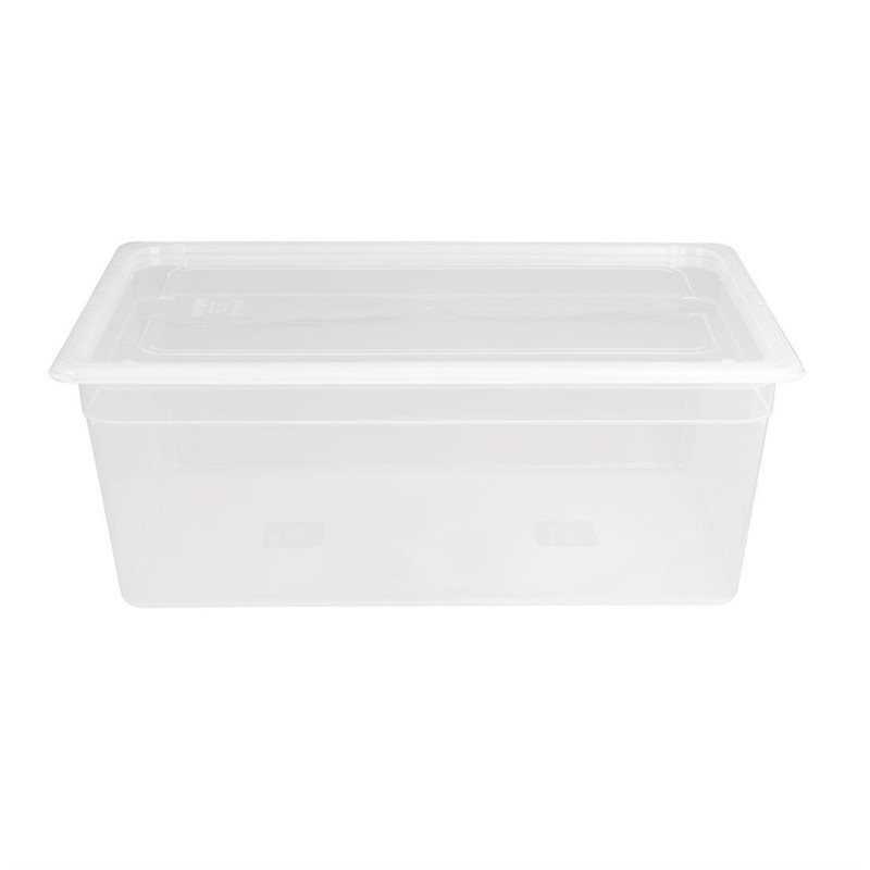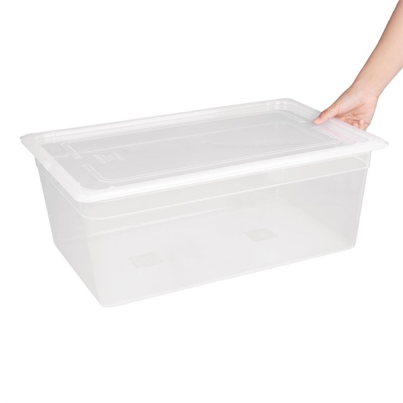 The Vogue polypropylene 1/1 gastronorm container with lid (200mm/25.6 litre) is an ideal high capacity solution for storing large quantities of food.