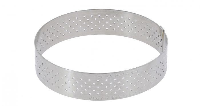 Stainless steel round perforated tart ring ideal for tarts, tartlets, cakes and quiches, developed in partnership with the Ecole du Grand Chocolat Valrhona. Perfect for cooking shortbread, puff or shortcrust pastry. The rings feature holes for even cooking of the tart crust. The straight edge allows for a flawless finish of petit gateau desserts and easy mould release. Spring stainless steel. Flexible ring for easy mould release, and which always returns to its initial shape. Perfectly aligned sides, no offset where welded. Perfect finish. Goes in the freezer, deep-freezer, blast chiller, refrigerator. Oven-safe. Care: dishwasher-safe.