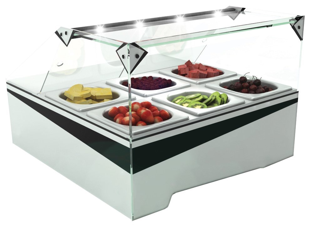 static cooling +4° up to +8°C in the tub area • for 6x 1/6 GN x 65 mm • made of strengthened glass and stainless steel • electronic temperature control • sliding doors at the back • high power LED lighting for maximal attention • upper part usable as shelf • incl. GN containersSpecifications