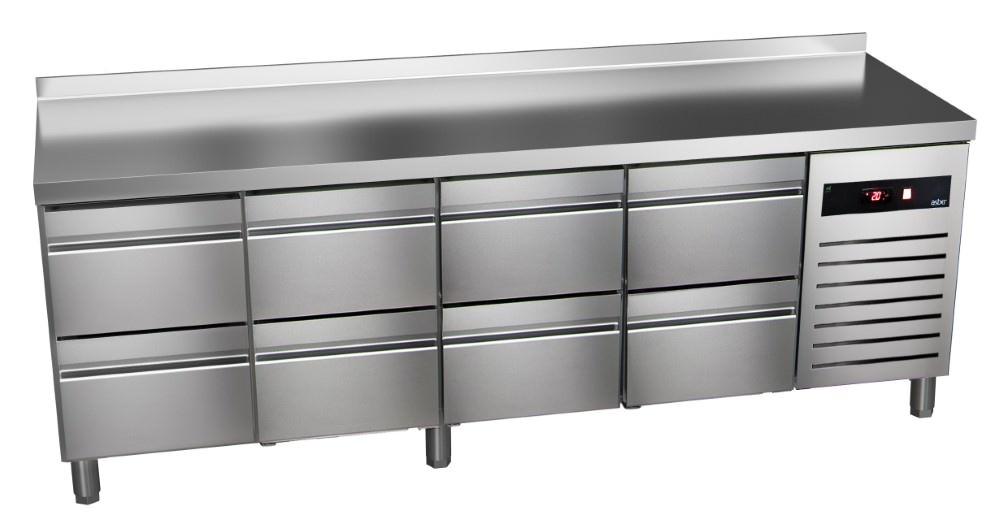 Refrigerated Table with Splashback with 8 Drawers 259 L, from -2 °C to 8 °C, Side-Mounted Compressor