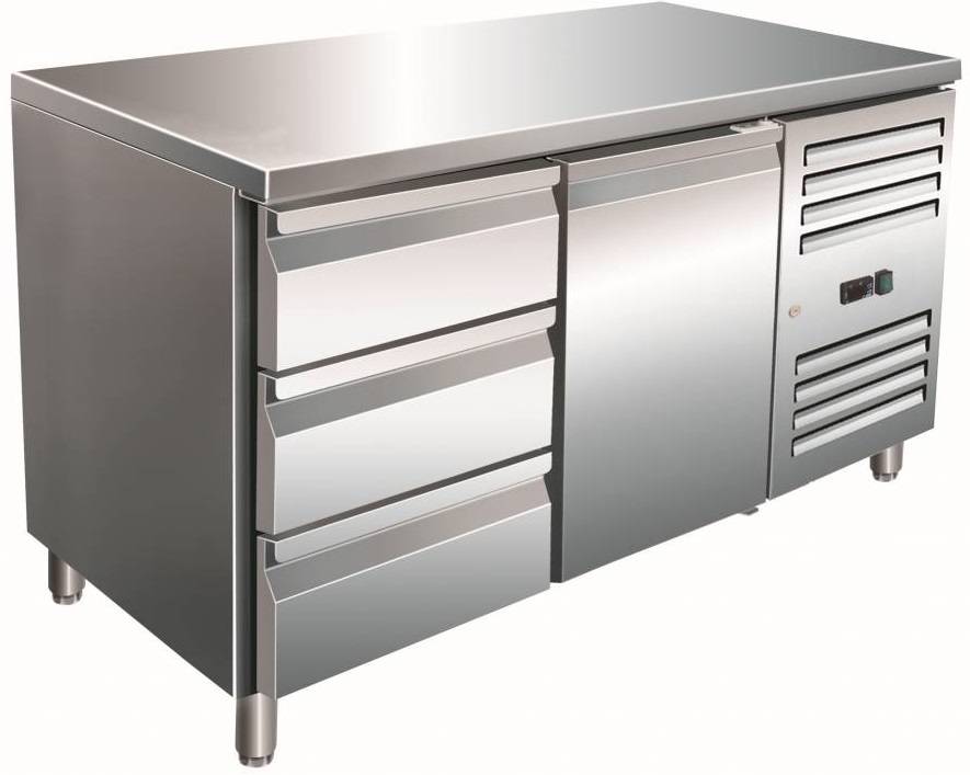 Single Door Refrigerated Table with 3 Drawers 314 L, from -2 °C to 8 °C, Side-Mounted Compressor