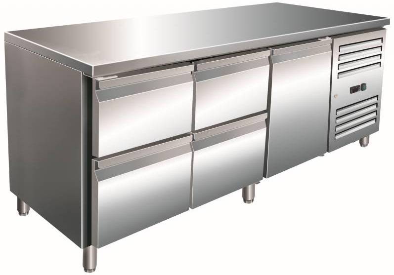 Single Door Refrigerated Table with 4 Drawers 465 L, from -2 °C to 8 °C, Side-Mounted Compressor