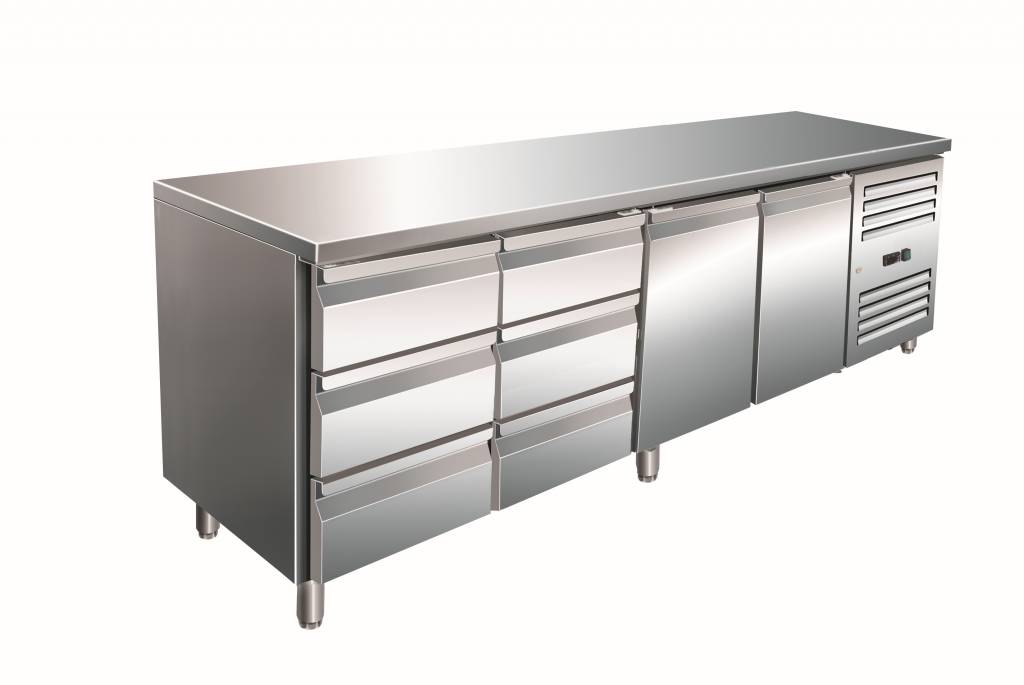 Double Door Refrigerated Table with 6 Drawers 616 L, from -2 °C to 8 °C, Side-Mounted Compressor