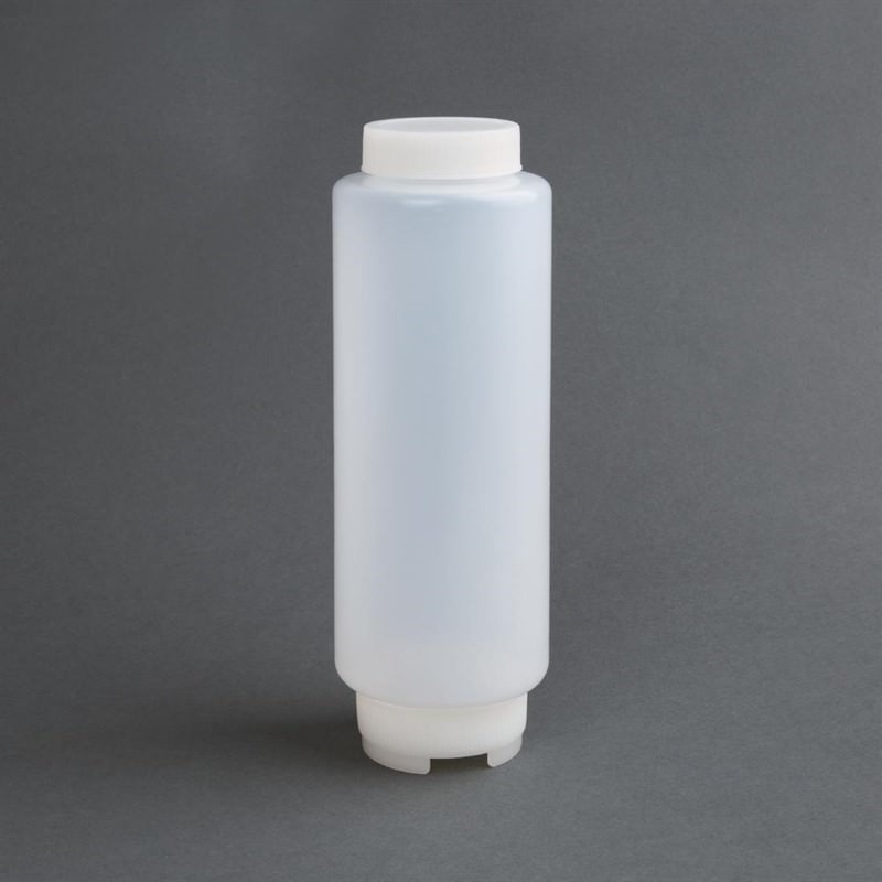 Squeezable bottles which fill from the top and dispense from the bottom. Can aid proper food rotation, and the silicone non-drip tap eliminates drips and the need to flip the bottle over to dispense sauce.