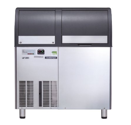 Efficient ice generator with built-in tank. Electronic control unit has a self-diagnosis and the warning, a housing with a durable stainless steel and the sliding door. The inlet and outlet are located on the front panel.
