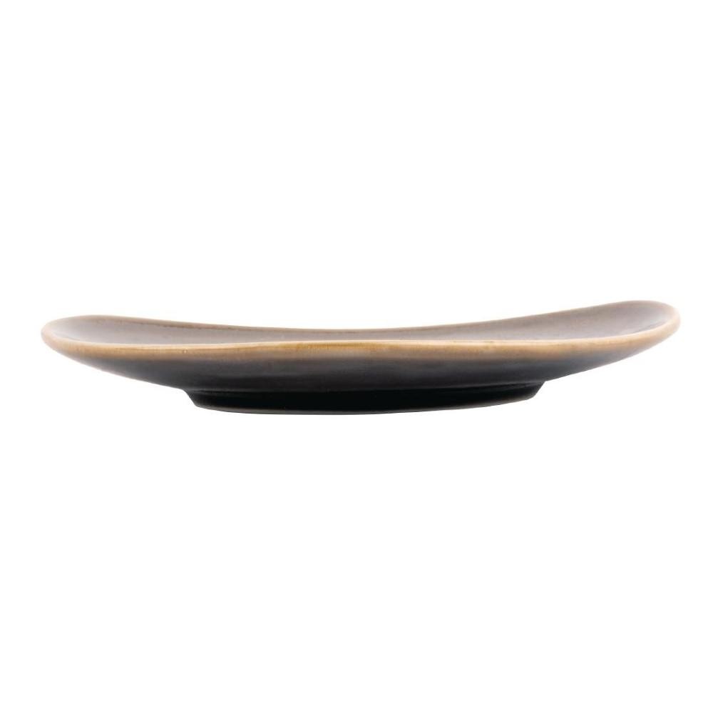 The rounded edges of this intriguingly shaped Olympia Kiln bowl contrast with the asymmetrical design to give the perfect platform for imaginative dinnertime presentation. The rustically themed glaze features subtle flecks and reacts in the kiln to create unique patterns on each item. Finished with a hand painted contrast rim, these plates are dishwasher and microwave safe and perfect for a range of modern cuisines.