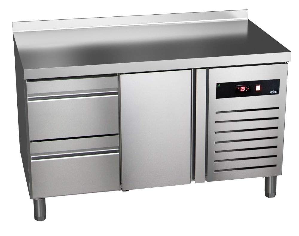 Single Door Refrigerated Table with Splashback and 2 Drawers 145 L, from -2 °C to 8 °C, Side-Mounted Compressor