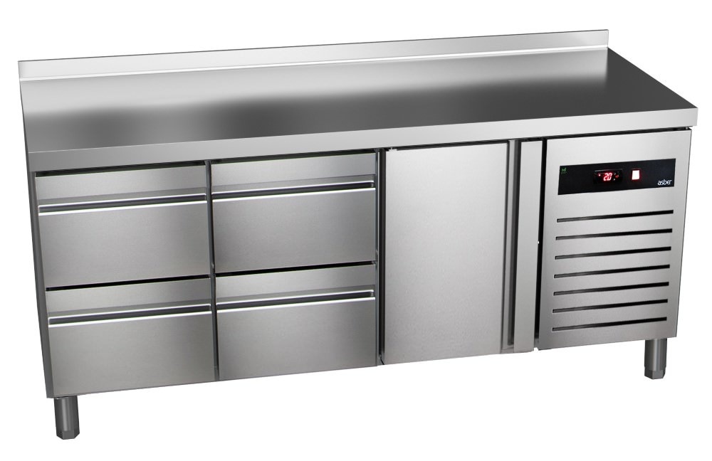 Single Door Refrigerated Table with Splashback and 4 Drawers 213 L, from -2 °C to 8 °C, Side-Mounted Compressor