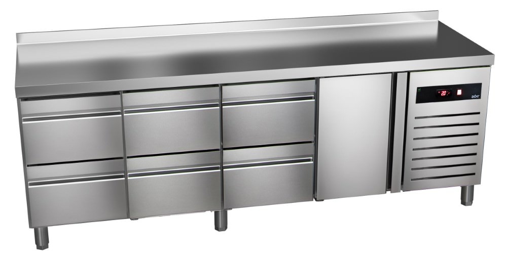 Single Door Refrigerated Table with Splashback and 6 Drawers 282 L, from -2 °C to 8 °C, Side-Mounted Compressor